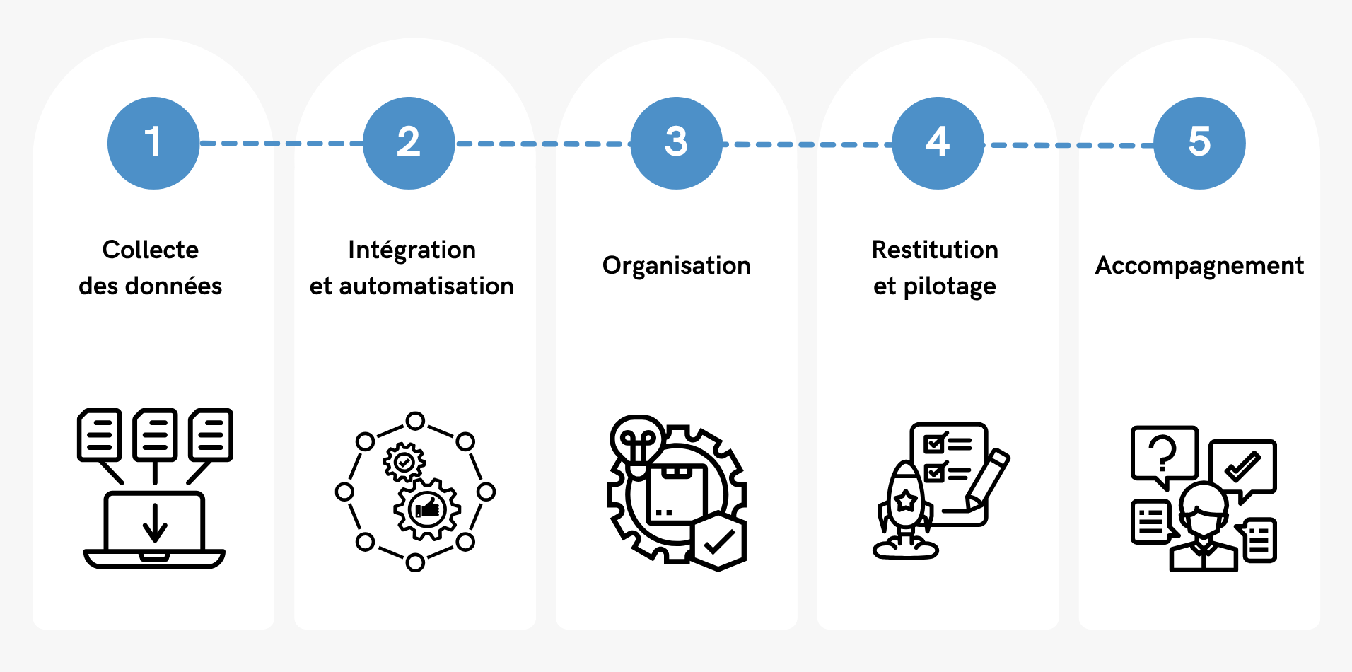 - Collecte des données : récupération des informations internes et externes (comptables, RH, commerciales, etc.)